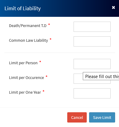 l) Once employee details have been captured, add the Limits of liability from modal shown below. The limit person is the maximum that a person can claim. The limit of occurence is the maximum to be paid in the event of any claim. The limit per year is the maximum to be paid during any period of insurance