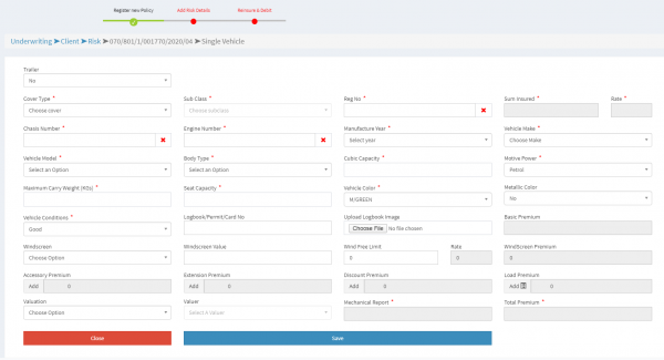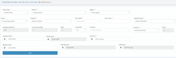 • Fill in the details as required and click on save to generate the policy and policy number