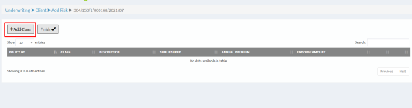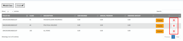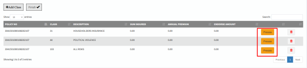 d) Once all classes have been captured, click on add classes to add them to the policy. e) To add risk details on a specific class, click on the Process; button as shown below. This will allow you to capture the details for each single class.