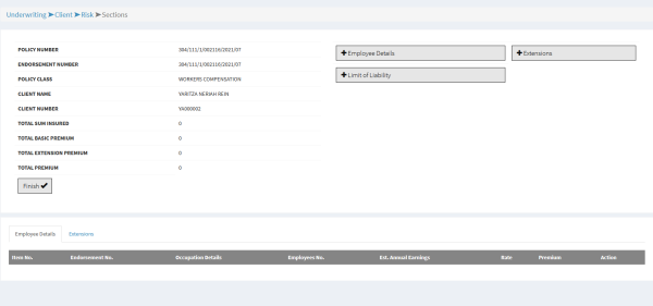 a) Select the client you wish to underwrite Workmen’s Compensation policy under. Fill in the details on the policy form and save to proceed.