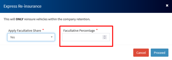 • When you click on the Express Reinsurance, you’ll be presented with the modal below, which gives you e the option of applying a facultative share on the vehicles you are reinsuring. See image below.