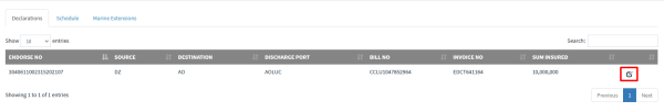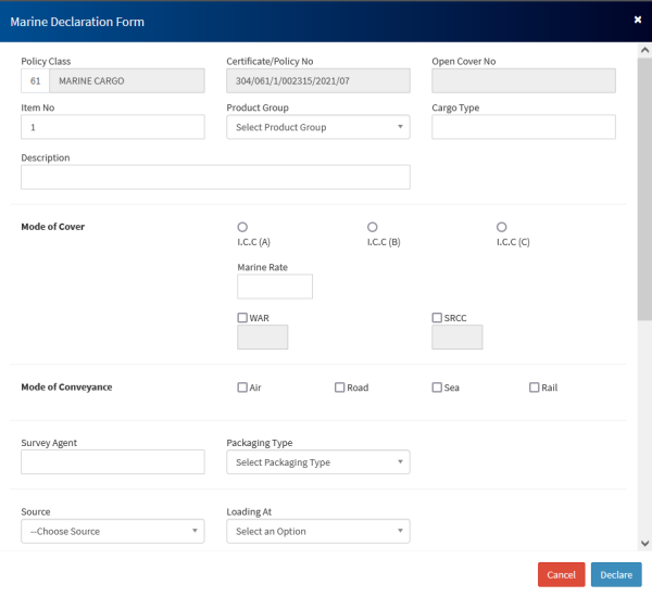 f)Once all items above have been captured, click on Declare to save the declaration. This will generate the premium to be charged and the sum insured.