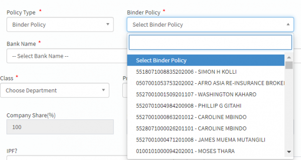• Binder/Scheme master policy field appears. Select master policy to use by searching in the drop down field. Click on the selected policy. The selected master policy auto populates Branch, Agency, Class and Product fields as set in the master policy.