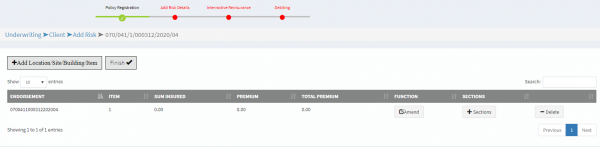 • f. Submitting the form saves the record, generates a policy number and directs you to the risk listing page below.
