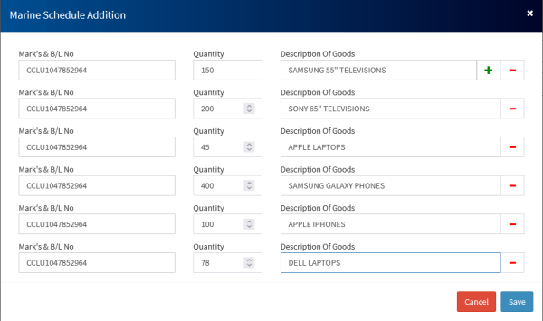 i) Next step is to capture the Marine Schedule. This is capturing the schedule of items that are covered. For instance, when importing electronics, the schedule would look as below