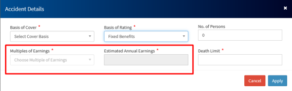 • For [fixed benefits capture the total benefit amount in the Death Limit field. For Multiple of Earnings input the estimated annual earnings in the Estimated annual earnings field. The death limit will show the multiple of earnings you selected from steps above.