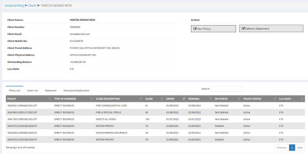 a) Select the client you wish to underwrite the Asset All Risk policy under. Fill in the details on the policy form and save to proceed. b) Once policy is generated, you’ll be shown the screen below.