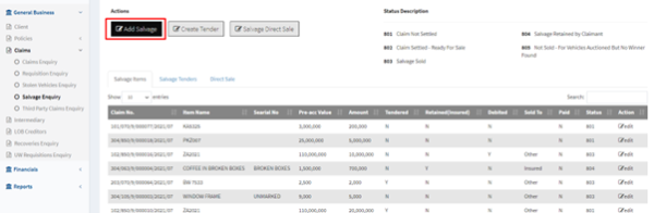 • a) Click on the Salvage Enquiry link to access Salvage processing page as shown below.